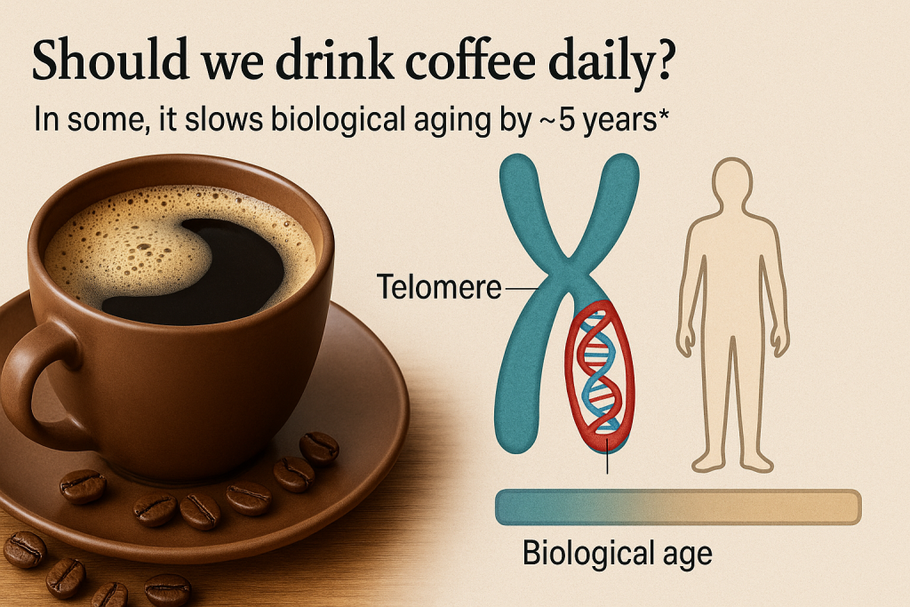 مطالعهای در BMJ Mental Health گزارش کرد که مصرف ۳ تا ۵ فنجان قهوه در روز در برخی افراد دچار اختلالات روانپزشکی عمده، با تلومرهای بلندتر و معادل حدود ۵ سال جوانتر بودن سن زیستی همراه است. در مقابل، مصرف بیش از ۵ فنجان چنین مزیتی نشان نداد.